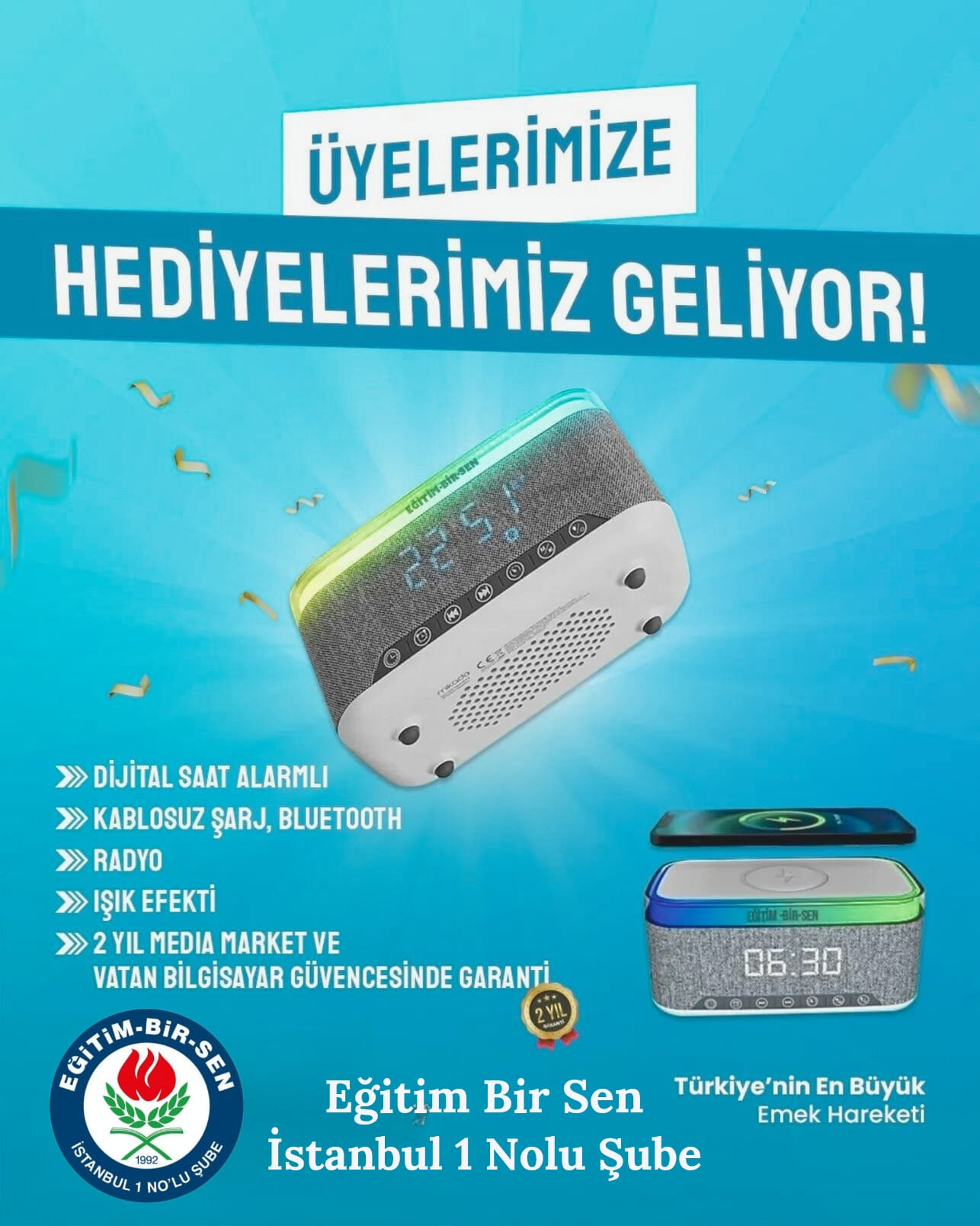 Hediyemiz;Radyolu, dijital saat ve alarmlı,Işık efektli, Kablosuz şarj özellikli,
